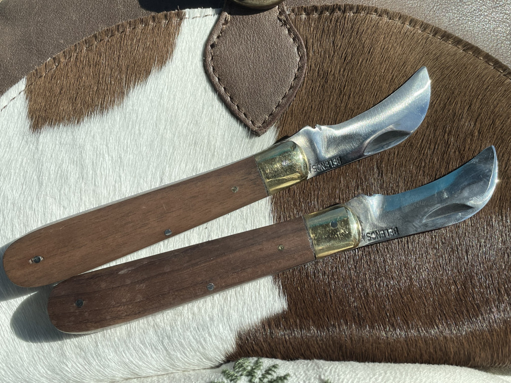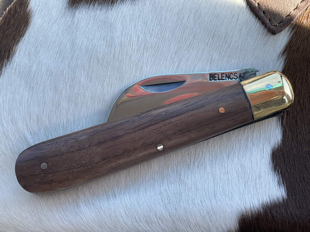 Szénacél pengés, borotvaélesre élezett, használatra kész körmöző bicska fa nyéllel.